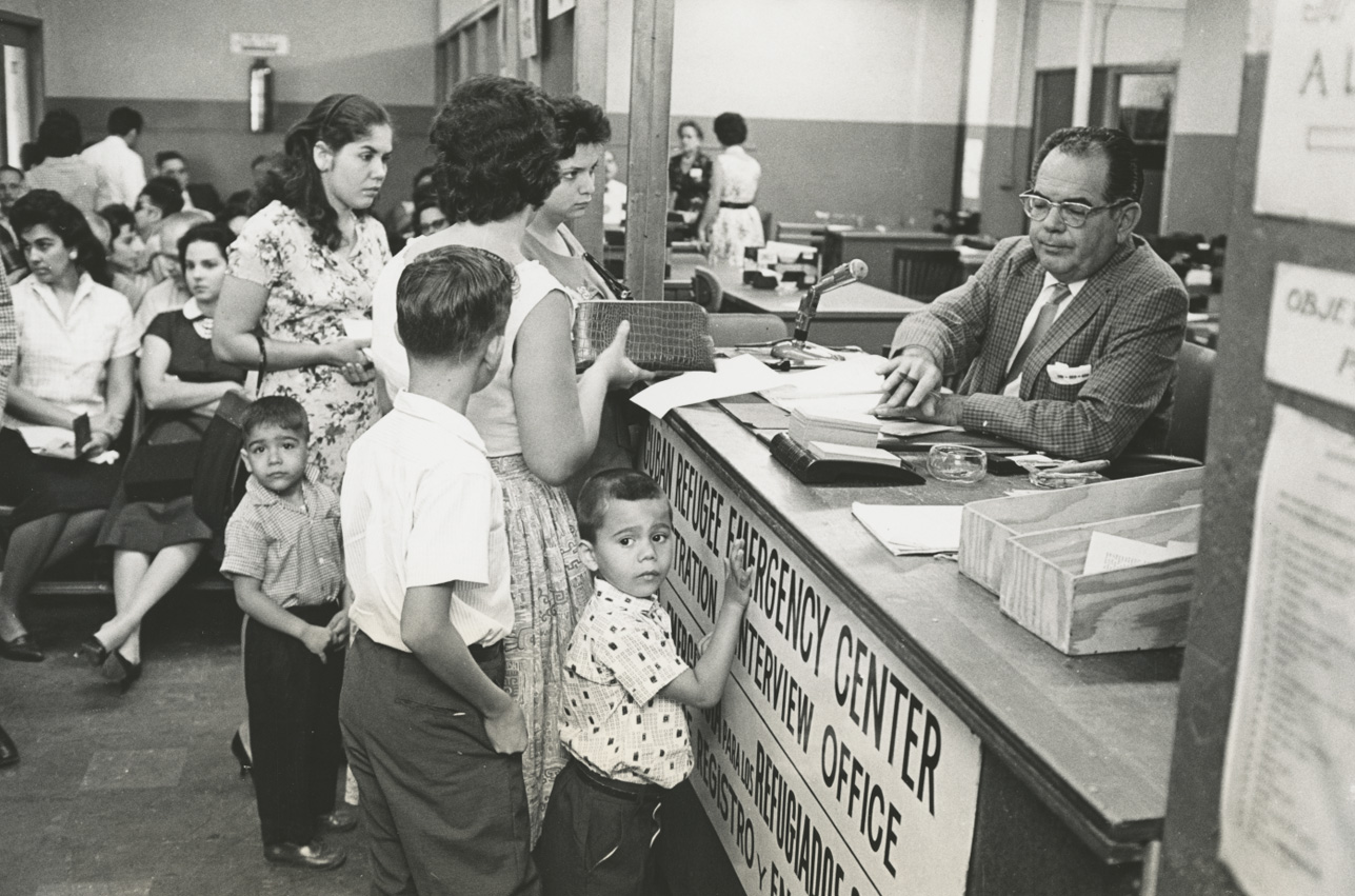 Cuban Refugee family at the registration counter, 1962. Cuban Refugee Center Records.